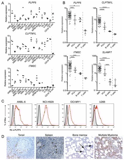 PLPP5, CLPTM1L and ITM2C are expressed in human Multiple Myeloma. (A) Expression of PLPP5, CLPTM1L, and ITM2C in human myeloma cell lines and primary human CD19+ B cells as determined by qPCR. Expression data was normalized by the house-keeping genes GAPDH, GPBP1 and TPT1. Bars show median normalized expression of experimental replicates (n = 3 myeloma cell lines, n = 4 for CD19+ primary peripheral B cells); (B) expression of PLPP5, CLPTM1L, ITM2C and SLAMF7 in primary bone marrow MM samples (n = 83), sorted plasma cells (n = 12), peripheral blood B cells (n = 4) and T cells (n = 4). Expression data was normalized as in (A). Bars show median expression and interquartile range. One-way ANOVA with Tukey’s multiple comparison test on log transformed data from MM, plasma cells and B cells; * (p < 0.05), *** (p < 0.001), **** (p < 0.0001). (C) cell surface expression of PLPP5 in human myeloma cell lines was determined by flow cytometry. Grey histograms: unstained cells, black lines: anti-rabbit (Rb) IgG control, red lines: Rb anti-PLPP5; (D) expression of CLPTM1L in human tonsil, spleen and bone marrow trephine from patients with non-Hodgkin’s Lymphoma (labeled, Bone marrow) or multiple myeloma. Spleen image was obtained from the Human Protein Atlas v18 (www.proteinatlas.org/ENSG00000049656-CLPTM1L/tissue/spleen#img). Images were captured at 100× magnification.