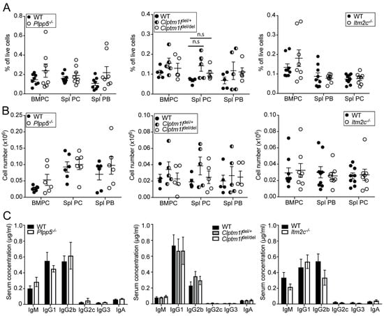 Characterization of ASC populations in Plpp5−/−, Clptm1ldel/+, Clptm1ldel/del and Itm2c−/− mice. (A) Frequency and; (B) total cell number of bone marrow plasma cells (BMPC), splenic plasma cells (Spl PC) and splenic plasmablasts (Spl PB) in Plpp5−/−, Clptm1ldel/+, Clptm1ldel/del, Itm2c−/− and age-matched WT mice. Results are combined from two (Clptm1l) or three (Plpp5, Itm2c) independent experiments. Each dot represents a single mouse, horizontal lines show the means ± SEM; (C) serum concentration of immunoglobulin isotypes in Plpp5−/−, Clptm1ldel/+, Clptm1ldel/del, Itm2c−/− and age- and sex-matched WT mice as determined by ELISA. Data are the mean of six samples from two independent experiments ± SEM. Statistical significance was analyzed using unpaired t-test, correcting for multiple comparisons. n.s., not significant (p > 0.05).