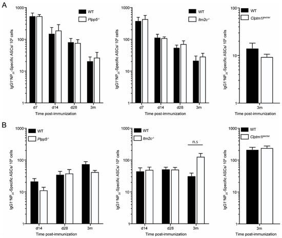 Characterization of the antigen-specific antibody response of Plpp5−/− Clptm1ldel/del and Itm2c−/− mice. Mice were immunized intraperitoneally with NP-KLH in alum and, at the indicated time post-immunization, the number of NP20-specific IgG1+ ASCs in the (A) spleen and (B) BM was determined by ELISpot. Plpp5 data are combined from three independent experiments at each time point where n = 3–6. Itm2c data are combined from 1 (day (d) 7) or 2 (d14, d28, 3 months (m)) independent experiments where n = 3–4. Clptm1l data are from 1 experiment where n = 4. Data are the mean ±SEM. Statistical significance was analyzed using unpaired t-test, correcting for multiple comparisons. n.s., not significant (p > 0.05).