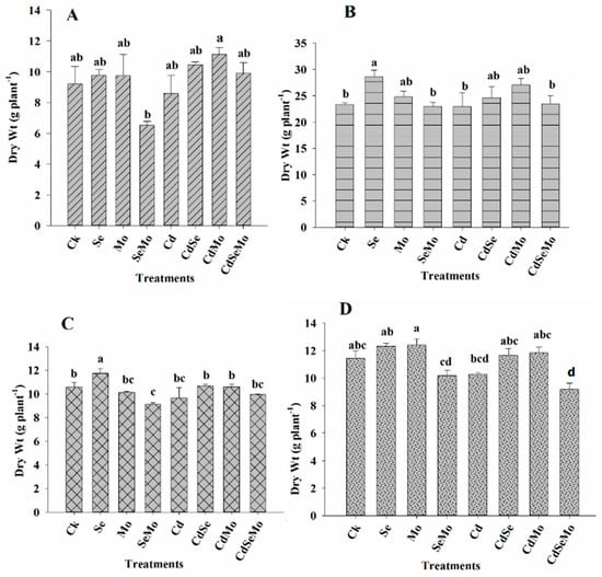 Dry biomasses of B. napus grown under different experimental conditions. Dry weight of root (A), stem (B), glume (C), and seed (D) of oilseed rape treated with foliar spray of (1 mg/L) Se and/or (0.3 mg/L) Mo in absence or presence of Cd stress (5 mg/kg). All data show the means ± SD of four replicates. Different letters within a column indicate significant (p < 0.05) differences between treatments.