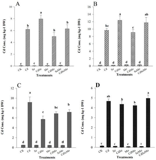 Concentrations of Cd in B. napus tissues. Cd concentration in root (A), stem (B), glume (C), and seed (D) of oilseed rape treated with foliar spray of (1 mg/L) Se and/or (0.3 mg/L) Mo in absence or presence of Cd stress (5 mg/kg). All data show the means ± SD of four replicates. Different letters within a column indicate significant (p < 0.05) differences between treatments.