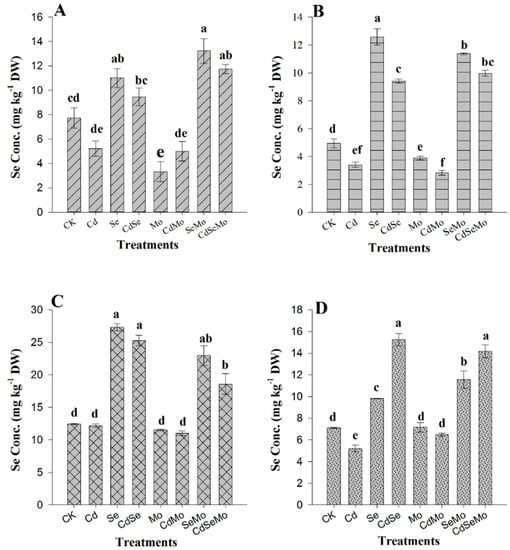 Concentrations of Se in B. napus tissues under different treatment conditions. Se content in root (A), stem (B), glume (C), and seed (D) of oilseed rape treated with foliar spray of (1 mg/L) Se and/or (0.3 mg/L) Mo in absence or presence of Cd stress (5 mg/kg). All data show the means ± SD of four replicates. Different letters within a column indicate significant (p < 0.05) differences between treatments.