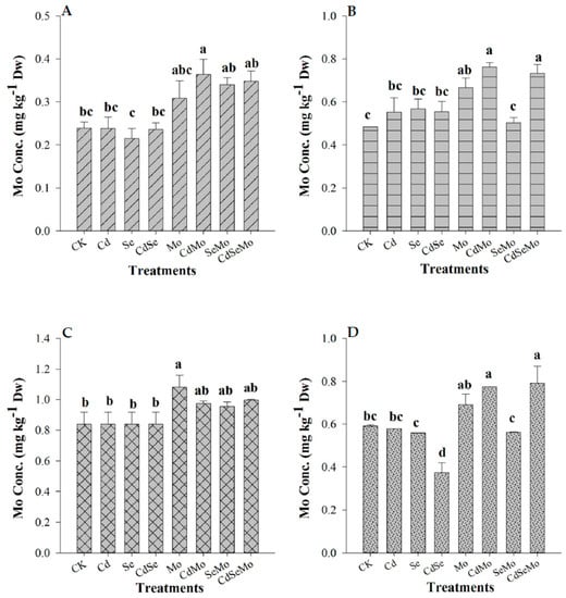 Concentrations of Mo in B. napus tissues under different treatment conditions. Mo content in root (A), stem (B), glume (C), and seed (D) of oilseed rape treated with foliar spray of (1 mg/L) Se and/or (0.3 mg/L) Mo in absence or presence of Cd stress (5 mg/kg). Bars indicate standard error (n = 4). Different letters indicate significant differences at (p < 0.05).