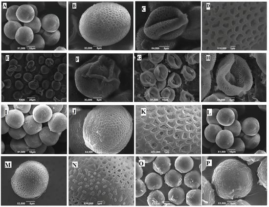 Scanning electron micrographs of B. napus’ pollen grains. Control (A–D), plants treated with Cd (E–H), Cd + Se (I–K), Cd +Mo (L–N), and Cd + Se + Mo (O,P). Plants were treated with foliar spray of Se (1 mg/L) and/or Mo (0.3 mg/L) in absence or presence of Cd stress (5 mg/kg).