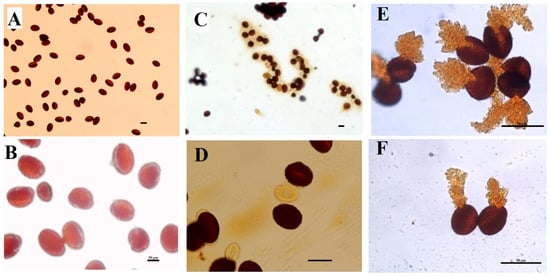 Pollen fertility of B. napus’ pollen grains. I2/KI staining for starch, normal mature pollen grains containing starch granules stain black or dark brown; however, the immature pollen grains appear orange to red; CK (A,B) and Cd-treated plants (C–F). Pollen from control have uniform shape, but Cd treated plants sometimes have burst pollen. Pollens were collected from plants treated with foliar spray of Se (1 mg/L) and/or Mo (0.3 mg/L) in the absence or presence of Cd stress (5 mg/kg). Scale bar: 50 μm.