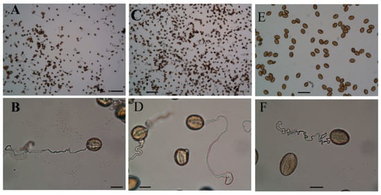 Effect of Cd on in vitro germination of pollen grains in B. napus. Control (A,B), 100 μM cadmium-treated sample (C,D), 500 μM cadmium-treated sample (E,F), pollens are germinated in a culture medium contains polyethylene glycol 4000 (20%) and sucrose (5%). Scale bar: 20 μm.
