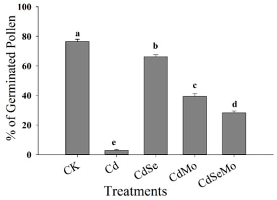In vitro germination (%) of pollen grains under Cd stress. Pollens are germinated in a culture medium contains polyethylene glycol 4000 (20%) and sucrose (5%) under 500 μM Cd in the presence of Se (10 μM) and/or (1 μM) Mo. Different letters indicate significant differences at (p < 0.05).