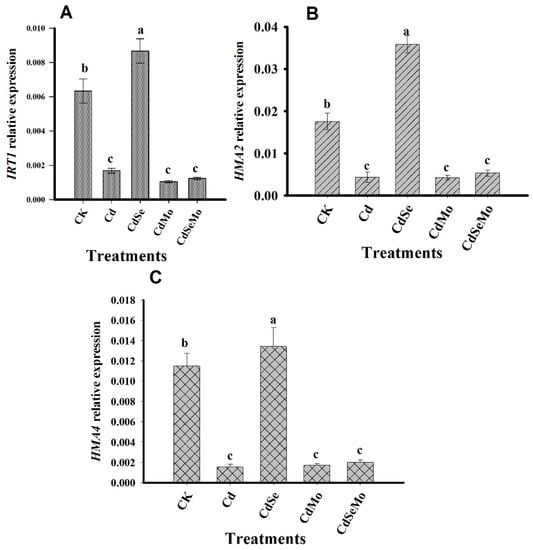 In our study, Se enhanced the expression of IRT1 in root tissues leading to enhanced Cd-uptake by the roots, which could explain the high Cd content in Cd + Se treatment in roots as compared to Cd only. The expression of HMA2 and HMA4 was significantly reduced under Cd stress, except on applying Se, which up-regulates these genes leading to more root-to-shoot translocation of Cd in a good agreement with the high Cd concentration accumulated in stem under the same treatment. There are several reports in literature indicating that the increased expression level of HMA2 or HMA4 induced Cd xylem uploading for translocation to the shoots, leading to higher Cd content in plant shoots [,]. In contrast, Mo application down-regulated IRT1 gene expression resulting in lower Cd uptake by the plant roots. Additionally, it did not enhance genes responsible for Cd-translocation, i.e., HMA2 and HMA4, which interpret the lower accumulation of Cd in plant stems in Cd + Mo treatment.