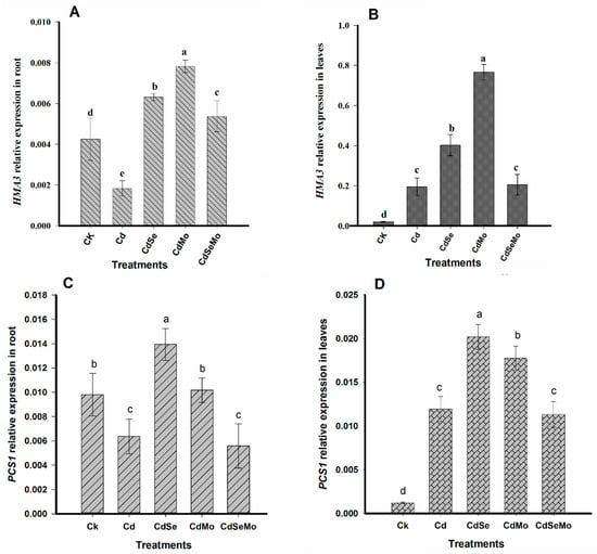 To investigate how Se and Mo application could control Cd-uptake and its further transport at the genetic level, we have examined the relative expression of several genes that might be involved in Cd uptake or detoxification such as IRTI, HMA2, HMA3, and HMA4 in those treatments where plants were exposed to cadmium stress. However, studying those genes controlling Cd uptake and translocation could not completely explain the protective role of Se on pollen grains and the low Cd in seed. Therefore, another gene i.e., PCS1 was considered which is known to provide Cd tolerance and control Cd accumulation in seeds. The expression of the IRT1 gene in roots significantly increased (p < 0.01) in the presence of Se, as compared to Cd only. However, no significant differences were observed in IRT1 expressions between other treatments, i.e., Cd, Cd + Mo, and Cd + Se + Mo (Figure 11A). HMA2 and HMA4 are expressed in the plant roots 10 times higher than in leaves. In roots, both of them showed the same trend where the genes are overexpressed in Cd + Se treatment. Mo treatments did not result in a significant change in the two genes expressions when applied alone, and it even down-regulates HMA2 and HMA4 expressions when it was amended with Se (Figure 11B,C).