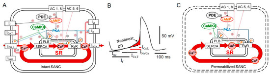 During each spontaneous cycle, the intracellular “Ca2+ clock” in SANC dynamically interacts with the ensemble of surface membrane ion channels and other electrogenic carriers and pumps, the “Membrane clock”. Specifically, L-type Ca2+ channels and INCX control Ca2+ influx and efflux from the cell and define the amount of Ca2+ available for pumping into SR and, as a result, govern the SR Ca2+ load and timing of LCR generation (Figure 1A,B). The most recent simulations explored a possible positive feedback mechanism, called action potential ignition, which accelerates the diastolic depolarization to reach the action potential threshold [37]. Therefore, in intact SANC, the “Ca2+ clock” and “Membrane clock” function together and mutually entrain each other since changes in membrane currents directly or indirectly regulate intracellular Ca2+ cycling, while changes in SR Ca2+ cycling, in its turn, modulate parameters of ionic channels [24,25,26,28,38].