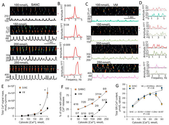 Spontaneous local Ca2+ releases are more robust and periodic in permeabilized rabbit SANC than in ventricular myocytes (VM). (A,C) Confocal images, Ca2+ waveforms; and (B,D) fast Fourier transform (FFT) of Ca2+ waveforms showed more rhythmic and large Ca2+ releases in saponin-permeabilized rabbit SANC than in ventricular myocytes bathed at the same cytosolic free [Ca2+]f (modified from Sirenko et al. [35]). (E) Total amount of Ca2+ released from the SR (total Ca2+ signal mass) was comparable between SANC and ventricular myocytes at 50–100 nmol/L [Ca2+]f and significantly higher in SANC than in ventricular myocytes at [Ca2+]f > 150 nmol/L. (F) Relative number of cells generated periodic spontaneous Ca2+ releases was higher in SANC than that in ventricular myocytes at the same [Ca2+]f. (G) SR Ca2+ content was comparable in saponin-permeabilized SANC and VM at physiological Ca2+ concentration (50–250 nmol/L), and significantly higher in VM than in SANC at 300 nmol/L [Ca2+]f. *Indicates statistical significance (p < 0.05).
