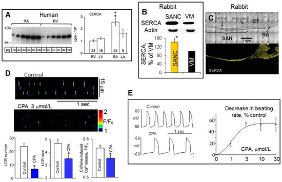 SR Ca2+ pump, SERCA, is more abundant in SANC than in ventricular myocytes. (A) Representative Western blot (left) and average data (right) showed that SERCA is more abundant in the human right atrium (RA) compared to right (RV) or left (LV) ventricle (* p < 0.05 vs. RV, + p < 0.05 vs. LV, Bonferroni post hoc ANOVA; modified from Boknık et al. [75]). (B) Representative Western blots (top) and average data (bottom) confirmed increased abundance of SERCA in rabbit SANC compared to ventricular myocytes (VM) (modified from Sirenko et al. [35]). (C) Immunolabeling of rabbit SA node tissue sections showed robust SERCA labeling within the center and periphery of the SA node (modified from Lyashkov et al. [61]). (D) Suppression of SERCA by cyclopiazonoc acid (CPA, 3 µmol/L) significantly decreased average LCR number, size and SR Ca2+ load in permeabilized rabbit SANC (modified from Vinogradova et al. [36]). (E) CPA dose-dependently decreased spontaneous firing rate of intact rabbit SANC (modified from Vinogradova et al. [36]). * Indicates statistical significance (p < 0.05).
