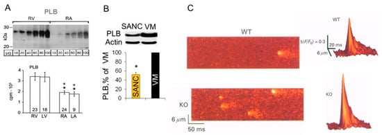 Comparison PLB abundance in SANC and ventricular myocytes. (A) Representative Western blot (top) and average data (bottom) showed that PLB is less expressed in human right (RA) or left (LA) atrium than in right (RV) or left (LV) ventricle (* p < 0.05 vs. RV, + p < 0.05 vs. LV, Bonferroni post hoc ANOVA; modified from Boknık et al. [75]). (B) Representative Western blot (top) and average data (bottom) showed that PLB was less abundant in rabbit SANC than in VM (modified from Sirenko et al. [35]). (C) Confocal line-scan images (left) and surface plots (right) of WT and PLB-KO mouse VM showed that spontaneous Ca2+ sparks were three times more frequent and larger in amplitude in KO cells than that in WT (modified from Santana et al. [99]]). * Indicates statistical significance (p < 0.05).