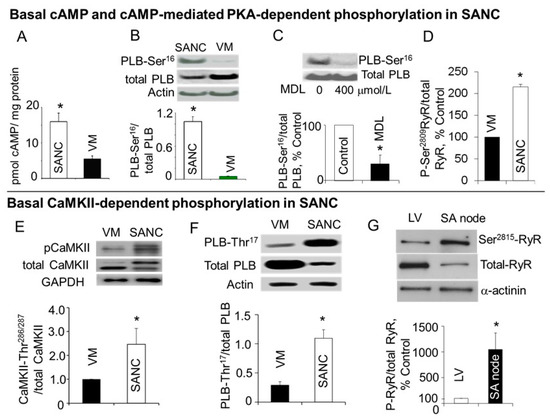 Basal levels of cAMP, PKA- and CaMKII-dependent phosphorylation in rabbit SANC and ventricular myocytes (VM). (A) Basal level of cAMP was substantially higher in SANC than in ventricular myocytes (modified from Vinogradova et al. [113]). (B) Basal level of PLB phosphorylation was significantly increased at PKA-dependent Ser16 site in SANC compared to VM (modified from Vinogradova et al. [106]). (C) Adenylyl cyclase inhibitor, MDL-12,330A, suppressed PLB phosphorylation at Ser16 site in SANC (modified from Vinogradova et al. [106]). (D) Basal level of RyR phosphorylation at Ser2809 site was markedly higher in SANC compared to VM (modified from Li et al. [39]). (E) Basal level of activated (autophosphorylated at Thr286/287) CaMKII (pCaMKII) was ~2-fold higher in SANC compared to ventricular myocytes (modified from Li et al. [39]). (F) Basal phosphorylation of PLB at the CaMKII-dependent Thr17 site (PLB-Thr17) was ~3-fold higher in SANC compared to VM (modified from Li et al. [39]). (G) Basal phosphorylation of RyR at CaMKII-dependent Ser2815 site (Ser2815-RyR) was ~10-fold higher in the rabbit SA node than that in the left ventricle (LV) (modified from Li et al. [39]]). * Indicates statistical significance (p < 0.05).
