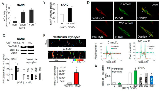 Ca2+-dependent modulation of cAMP and PKA-dependent phosphorylation in rabbit SANC, but not in ventricular myocytes. (A) Ca2+-dependent increase of AC activity of whole cell lysates of intact SANC (modified from Younes et al. [9]). (B–E) (modified from Sirenko et al. [35]): (B) An increase in cytosolic free [Ca2+]f produced an increase in cAMP concentration in permeabilized SANC. (C) An increase in cytosolic free [Ca2+]f increased phosphorylation of PLB at Ser16 site in permeabilized SANC, but not in ventricular myocytes. (D) Representative permeabilized SANC immunolabeled for total and phosphorylated RyR at Ser2809 (kept at 0 (top) or 200 nmol/L (middle) [Ca2+]f respectively); pixel-by-pixel fluorescence intensities (bottom) showed that increase in cytosolic [Ca2+]f produced an increase in RyR phosphorylation. (E) Average data of changes in RyR phosphorylation at Ser2809 produced by an increase in cytosolic [Ca2+]f in permeabilized SANC and ventricular myocytes. Ca2+-stimulated RyR phosphorylation in SANC at 200 nmol/L [Ca2+]f could be partially reversed by inhibition of PKA by PKA inhibitor peptide (PKI) or CaMKII inhibitor (KN-93, but not its inactive analog KN-92), indicating that this site is phosphorylated by both PKA and CaMKII. (F) An increase in cAMP level in permeabilized rabbit ventricular myocytes transformed stochastic Ca2+ sparks into more rhythmic and large Ca2+ wavelets (top and middle panels) and significantly increased total amount of Ca2+ released from the SR (total Ca2+ signal mass, bottom panel) (modified from Sirenko et al. [66]). * Indicates statistical significance (p < 0.05).