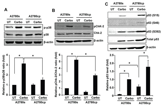 We selected the proteins in the first group for validation by Western blotting. We left A2780s and A2780cp cells untreated or treated them with 50 µM carboplatin for 24 h, and used the whole cell lysates for Western blotting. p38 MAPK regulates an array of downstream targets and activation of p38 MAPK can either promote or suppress growth, metastasis, and chemoresistance in a context-dependent manner [11,12,13]. Consistent with the kinase array results, Western blotting showed that p38 MAPK was phosphorylated in both A2780s and A2780cp cells; however, its phosphorylation was more markedly increased by carboplatin in A2780s cells compared to A2780cp cells (Figure 1A). Quantification of p38 MAPK phosphorylation showed that carboplatin-induced p38 MAPK phosphorylation in A2780s was two-fold higher compared to A2780cp cells (Figure 1A).