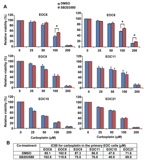 High-grade serous EOC is the most common and lethal histological subtype [2]. However, the A2780 cell line has been shown to be a poor model for high-grade serous EOC [26]. We therefore used six primary high-grade serous EOC cells isolated from patients’ ascites in this study. These cells display different morphology, indicating the heterogeneity in cell morphology among the samples (Supplementary Figure S3). We confirmed that the ascites-derived cells express paired-box gene 8 (PAX8, a marker for serous ovarian cancer) as determined by immunocytochemistry and Western blotting (Supplementary Figures S4 and S5) [29,30,31], as well as cytokeratins as determined by Western blotting using a pan-keratin antibody (Supplementary Figure S5) as we previously reported in EOC cell line SKOV3 and OVCA429 cells [32]. These data thus confirmed the EOC origin of the ascites-derived cells. We found that the primary EOC cells obtained from patients before treatment (EOC6 and EOC9) (Table 1) grew faster than the cells obtained from the recurrent patients who had received treatment (EOC8, EOC11, EOC15, and EOC21) (Table 1). Specifically, after three days in culture, the viable cell numbers as determined by the neutral red uptake assay were increased by 2.2 and 2.7 fold in EOC6 and EOC9, respectively, and by 2.0, 1.8, 1.4, and 1.5 fold in EOC8, EOC11, EOC15, and EOC21, respectively. Interestingly, EOC6 and EOC9 displayed a cobblestone morphology, whereas EOC8, EOC15, and EOC21 displayed a more spindle morphology (Supplementary Figure S3). The primary EOC cells were treated with increasing concentrations of carboplatin in the presence of 10 µM SB203580 or an equal volume of DMSO for 72 h. As shown in Figure 3, these primary cells displayed variable sensitivity to carboplatin. Regardless of the sensitivity to carboplatin, SB203580 co-treatment did not significantly change the response of the primary EOC cells to carboplatin (Figure 3A,B). Specifically, SB203580 slightly increased the IC50 for carboplatin in EOC6 and EOC8, but it did not change the IC50 in the other four primary EOC cells. However, interestingly, we found that treatment of SB203580 at 10 µM for 48 or 72 h increased the number of viable cells in all primary EOC cells (Figure 4).