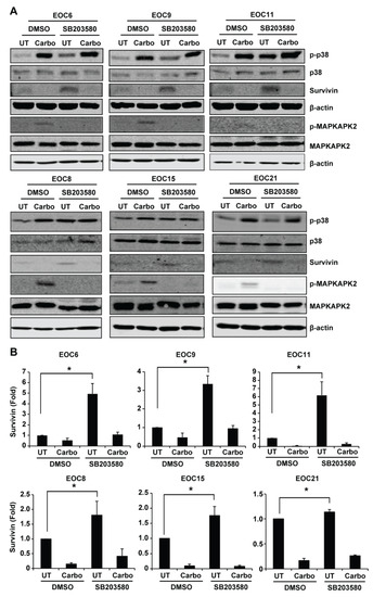 In this study, using a proteome profiler human phospho-kinase array, we showed that cisplatin-sensitive A2780s and its derivative cisplatin-resistant A2780cp cells displayed different basal and carboplatin-induced phosphorylation profiles in proteins involving multiple signaling pathways. Among the differentially phosphorylated proteins, p38 MAPK phosphorylation was more markedly increased by carboplatin in A2780s cells compared to A2780cp cells. Using the specific p38 MAPK inhibitor SB203580, we demonstrated that inhibition of p38 MAPK increased resistance to carboplatin in A2780cp cells, but not in A2780s cells. Because the A2780 cell line has been shown to be a poor model for high-grade serous EOC [26] and high-grade serous EOC is the most common and lethal histological subtype [2], we examined the effect of SB203580 in primary high-grade serous EOC cells isolated from patient’s ascites. We determined that p38 MAPK phosphorylation was induced by carboplatin in primary high-grade serous EOC cells that displayed a variable sensitivity to carboplatin. Inhibition of p38 MAPK by SB203580 had minimal or no effect on carboplatin-induced cytotoxicity in primary EOC cells. However, interestingly, SB203580 treatment increased the number of viable cells in the primary EOC cells, which was concomitant with increased survivin expression. This is the first study to examine the effect of p38 MAPK on growth and carboplatin sensitivity in primary EOC cells.