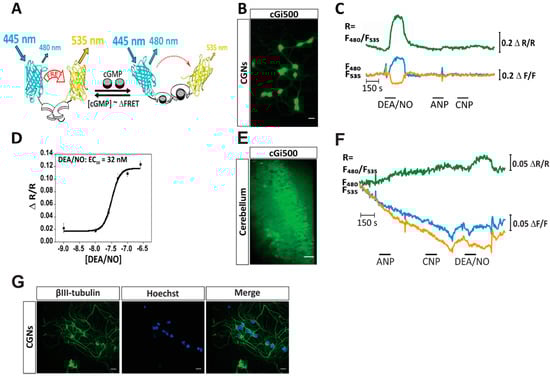 Primary CGN cultures were prepared from 7-day-old R26-CAG-cGi500(L1) mice [], which express the cGi500 sensor ubiquitously. As expected, CGNs showed a strong expression of the cGMP sensor protein (Figure 1B, green fluorescence). It is important to note that the green fluorescence shown in Figure 1B shows the YFP emission of the sensor and not the cGMP concentration, which is reflected by the CFP/YFP emission ratio. To determine which substances can induce a reliable elevation of cGMP in CGNs, the cells were exposed to ANP (100 nM), CNP (100 nM), or the NO-releasing compound diethylamine NONOate (DEA/NO) (100 nM) during real-time imaging under continuous flow. As documented in Figure 1C, application of DEA/NO induced a robust cGMP elevation as indicated by a simultaneous increase in CFP emission (cyan trace) and decrease in YFP emission (orange trace), resulting in an increased CFP/YFP ratio (green trace). Application of ANP or CNP did not result in a cGMP increase. To determine the sensitivity of the cGMP response of CGNs to DEA/NO, a concentration-response experiment was performed, revealing an EC50 of ≈32 nM (Figure 1D). cGMP was also visualized in freshly prepared cerebellar slices isolated from R26-CAG-cGi500(L1) mice (Figure 1E). Cerebellar slices were exposed to ANP (250 nM), CNP (250 nM), and DEA/NO (5 µM) during real-time imaging under continuous flow. As expected, the application of DEA/NO, but not ANP or CNP, resulted in elevated cGMP in the granule cell layer of the cerebellum (Figure 1F, green trace). The failure to detect ANP- or CNP-induced cGMP increases (Figure 1C,F) could have been related to technical issues, such as an inability of the cytosolic cGi500 sensor to detect presumably membrane-associated cGMP pools that are generated in response to natriuretic peptides. However, this possibility is highly unlikely, because the cytosolic cGi500 sensor has been successfully used to detect ANP- and CNP-induced cGMP signals in various other cell types including smooth muscle cells [] and dorsal root ganglion neurons [].