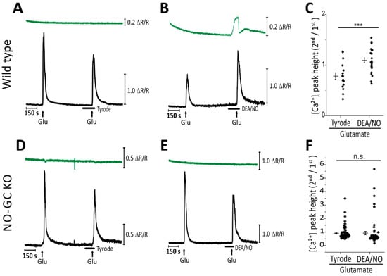 NO could have influenced [Ca2+]i via a cGMP-dependent or -independent mechanism. To determine the importance of cGMP in the observed augmented [Ca2+]i, CGN cultures were prepared from cGMP sensor mice, which lacked the β1 subunit of NO-GC (NO-GC KO) [] and, therefore, expressed no functional NO-GC. These CGNs showed normal glutamate-induced Ca2+ transients (Figure 2D, black trace, and Figure 2F, Tyrode). As expected, NO-GC KO CGNs showed no increase in the cGMP concentration upon addition of DEA/NO (100 nM) (Figure 2E, green trace), confirming the absence of functional NO-GC in these cells. In contrast to wild-type CGNs (Figure 2A–C), NO-GC KO cells showed similar glutamate-induced Ca2+ transients in the absence and presence of DEA/NO (Figure 2D–F). These results strongly supported the notion that NO potentiation of [Ca2+]i in CGNs is mediated by activation of NO-GC and generation of cGMP.