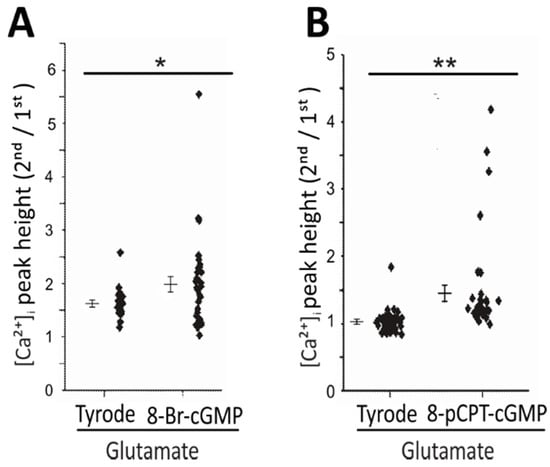 To further test the importance of cGMP in augmented glutamate-induced Ca2+ signals, CGNs were stimulated with glutamate (100 μM) during superfusion with the membrane-permeable cGMP analogue 8-Br-cGMP (100 μM) or 8-pCPT-cGMP (100 μM). In the presence of 8-Br-cGMP or 8-pCPT-cGMP, glutamate-induced Ca2+ transients were significantly augmented compared to controls without cGMP analogues (Figure 3A, p < 0.05; Figure 3B, p < 0.01). In the experiments with 8-Br-cGMP, we noted that the peak height ratio of the second over the first Ca2+ transient under control conditions (Tyrode) was ≈1.6 (Figure 3A). This value was higher than the control ratios obtained in the other experiments, which were ≈0.8–1.0 (Figure 2C,F and Figure 3B). The variability of control transients might be related to different growth states of different CGN cultures. However, it is important to note that control cells (treated with Tyrode) and experimental cells (treated with DEA/NO or cGMP analogues) were always measured side-by-side with the same batch of cells. Therefore, the potential variability in the control ratio between different CGN cultures should not have been a major confounding factor in these experiments. The results with cGMP analogues further supported a cGMP–Ca2+ crosstalk in CGNs, which could be mediated via cGKs, CNG channels, or other cGMP effector proteins.