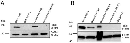 To determine if cGKs could be downstream targets of cGMP, lysates from our CGN primary cultures were analyzed via Western blot with highly specific cGKI and cGKII antibodies (Figure 4). Both antibodies were validated with respective knockout tissues to confirm their specificity. While the cGKI protein was readily detected in lysates from colon and cerebellum isolated from wild type mice, it was not detected in primary CGNs (Figure 4A). The cGKII protein was detected in lysates from jejunum of wild type mice, as well as in cerebellum isolated from wild type or cGKI knockout mice, but it was not detected in the our CGN lysates (Figure 4B).