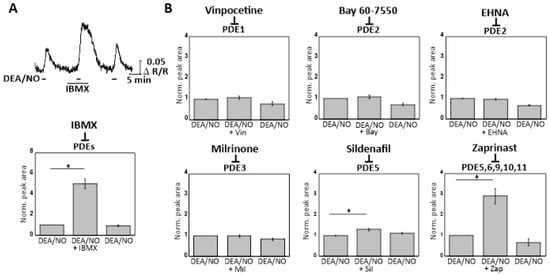 To evaluate which PDE(s) degrade cGMP in murine CGNs, the cells were exposed to various PDE inhibitors. CGNs from cGMP sensor mice were first superfused with DEA/NO (50 nM) alone (Figure 5A, first peak), and then with the general PDE inhibitor IBMX (100 µM) followed by DEA/NO (50 nM) in the presence of IBMX (Figure 5A, second peak) and a final application of DEA/NO (50 nM) alone (Figure 5A, third peak). IBMX alone had no influence on the basal cGMP level in cultured CGNs, however, it strongly potentiated the cGMP increase elicited by DEA/NO compared to DEA/NO alone (Figure 5A). To identify the PDEs that play a role in cGMP degradation in CGNs, specific PDE inhibitors [] were applied in the same manner as shown for IBMX in Figure 5A. These PDE inhibitors were Vinpocetine (5 µM) for PDE1, Bay 60-7550 (10 nM) for PDE2, EHNA (10 µM) for PDE2, Milrinone (10 µM) for PDE3, Sildenafil (20 µM) for PDE5, and Zaprinast (20 µM) for PDE5, 6, 9, 10, and 11. These measurements (Figure 5B) revealed a weak but significant effect of Sildenafil (p < 0.05) and a strong effect of Zaprinast (p < 0.05). The other tested PDE inhibitors did not show statistically significant effects on NO-induced cGMP elevation. These data implicated PDE5, 6, 9, 10, and 11 as possible cGMP-degrading PDEs in murine CGNs.
