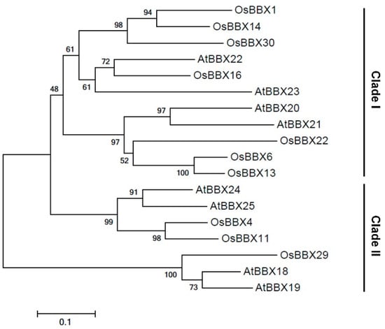 Phylogenetic tree of the BBX proteins of subfamily IV in Arabidopsis and rice. The numbers next to the nodes are bootstrap values from 1000 replications. The tree is drawn to scale, with branch lengths in the same units as those of the evolutionary distances that were used to infer the phylogenetic tree (scale bar, 0.1 amino acid substitutions per site). The deduced amino acid sequences were retrieved from the DDBJ/EMBL/GenBank databases. AtBBX18 (AT2G21320), AtBBX19 (AT4G38960), AtBBX20 (AT4G39070), AtBBX21 (AT1G75540), AtBBX22 (AT1G78600), AtBBX23 (AT4G10240), AtBBX24 (AT1G06040), and AtBBX25 (AT2G31380) are Arabidopsis thaliana proteins; OsBBX1 (Os01g0202500), OsBBX4 (Os02g0606200), OsBBX6 (Os02g0646200), OsBBX11 (Os04g0493000), OsBBX13 (Os04g0540200), OsBBX14 (Os05g0204600), OsBBX16 (Os06g0152200), OsBBX22 (Os06g0713000), OsBBX29 (Os09g0527900), and OsBBX30 (Os12g0209200) are Oryza sativa proteins.