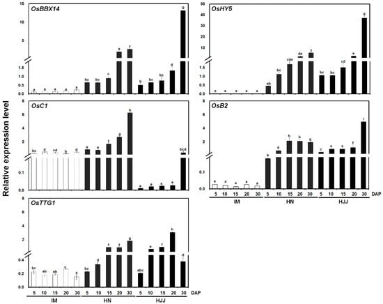 Expression of OsBBX14 and putative anthocyanin regulatory genes in nonpigmented (IM) and black (HN and HJJ) rice varieties during seed maturation. The numbers along the x-axis reflect the days after pollination (DAP). Results represent mean values ± SD from three biological replicates. Different letters above the bars indicate significantly different values (p < 0.05) calculated using two-way ANOVA followed by a Duncan’s multiple range tests.