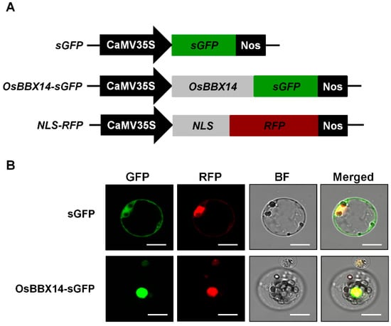 For the subcellular localization analysis, the ORF of OsBBX14 was amplified using the gene-specific primer sets (p326-OsBBX14-F/R), which were introduced into an XbaI-digested p326-sGFP plasmid using the In-Fusion HD Cloning Kit (Takara). The resultant p326-OsBBX14-sGFP plasmid was sequenced to confirm the absence of errors during PCR amplification. The plasmids were introduced into rice protoplasts prepared from rice leaf tissues using a polyethylene glycol-mediated transformation, as described by Kim et al. []. The expression of the p326-OsBBX14-sGFP construct was determined 16–20 h after transformation, and images were captured using fluorescence confocal microscopy (Leica TCS SP8; Leica Microsystems, Wetzlar, Germany).