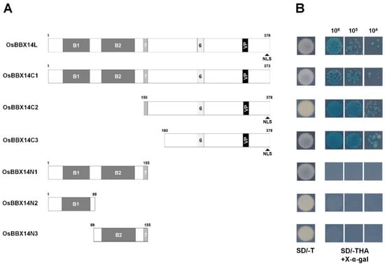 To analyze whether OsBBX14 has transcriptional activation activity, seven constructs containing full length (OsBBX14L) and partially truncated OsBBX14 proteins (OsBBX14C1, OsBBX14C2, OsBBX14C3, OsBBX14N1, OsBBX14N2, and OsBBX14N3) were fused in-frame to the GAL4 DNA-binding domain (GAL4-BD) of the pGBKT7 vector, after which their transcriptional activation activity was assayed in yeast (Figure 4). These constructs were transformed into the yeast strain AH109, then screened on both synthetic dropout (SD) media lacking tryptophan (SD/−T) and a triple dropout medium, which is SD media lacking tryptophan, histidine, and adenine (SD/−THA), supplemented with X-α-Gal. The transformants containing OsBBX14L grew well on the selection medium SD/−THA and turned blue in the presence of the chromogenic substrate X-α-Gal, indicating that OsBBX14 had strong activation activity. Among the partial clones of OsBBX14, the yeast transformants containing OsBBX14N1, OsBBX14N2, and OsBBX14N3, respectively, which lacked the C-terminal and central regions of the protein, did not grow on the selective medium and did not turn blue under the same conditions. In contrast, the partial clones, OsBBX14C1, OsBBX14C2, and OsBBX14C3, which lacked the N-terminal region of the protein, were able to grow on the selection medium. This suggests that the C-terminal and central region of OsBBX14 is required for its transcriptional activation activity. Taken together, these results indicate that OsBBX14 is a nucleus-localized transcription factor with a transcriptional activation activity, and its C-terminal is a functional region for the transcriptional activation.