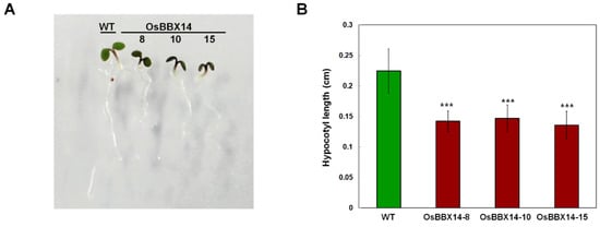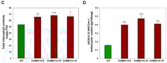 To investigate the function of OsBBX14, we generated transgenic Arabidopsis lines expressing OsBBX14 under the control of the CaMV35S promoter. We selected three of the 15 independent OsBBX14 transgenic plants obtained by floral dipping for further analysis. As shown in Figure 5, OsBBX14 transgenic Arabidopsis plants had shorter hypocotyl lengths, darker green leaves, and accumulated more anthocyanin than the WT plants. Under normal fluorescent light (FL) conditions, the hypocotyls of seven-day-old seedlings were 34–40% shorter in the OsBBX14 transgenic lines than the WT plants, while the chlorophyll content of the OsBBX14 transgenic Arabidopsis plants was 23–27% higher than the WT plants. In addition, the OsBBX14 transgenic lines showed a 2.5- to 3-fold increase in anthocyanin content when compared with the WT plants. These results indicated that OsBBX14 plays an important role in photomorphogenesis, regulating the accumulation of anthocyanin and chlorophyll as well as the length of the hypocotyl.
