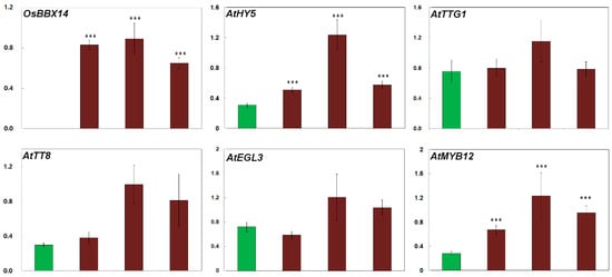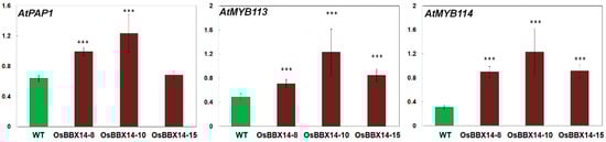 Expression analysis of anthocyanin biosynthesis regulatory genes in transgenic Arabidopsis plants expressing OsBBX14. All results represent the mean value ± SD from three biological replicates. *** indicate values that significantly differ from the expression level in WT at p < 0.001 according to Student’s t-tests.