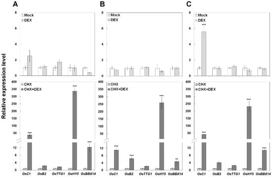 To activate OsBBX14 expression, the protoplasts were treated with 10 μM DEX for 4 h. The control protoplasts were mock-treated with the same concentration (0.01%) of ethanol used to dissolve DEX. To inhibit the synthesis of new proteins, 2 μM of the protein synthesis inhibitor CHX was added 30 min before the addition of DEX []. After the treatments, the protoplasts were harvested for qPCR analysis. The expression levels of each gene in the control protoplasts without DEX treatment was set to 1, and three biological replications were used. The gene-specific primers used for qPCR analysis are listed in Table S1.