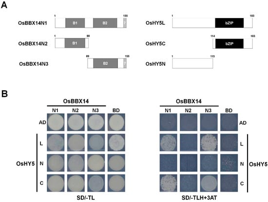 To investigate the interaction between OsBBX14 and OsHY5 at the molecular level, we performed a yeast two-hybrid (Y2H) assay. When OsBBX14 was fused with GAL4-BD, its transcriptional activation was detected; however, it disappeared when the C-terminal 223 amino acids of OsBBX14 were deleted (Figure 4). To identify the domains responsible for the OsBBX14-OsHY5 interaction, Y2H assays were performed using partially truncated OsBBX14 proteins (OsBBX14N1, OsBBX14N2, and OsBBX14N3) and either the whole OsHY5 protein (OsHY5L) or its N-terminal or C-terminal regions (OsHY5N and OsHY5C, respectively). As shown in Figure 8, OsBBX14N1, containing the B-box 1 and B-box 2 domains, strongly interacted with OsHY5C, which harbored the bZIP domain. OsBBX14N2, containing only the B-box 1 domain, was unable to interact with OsHY5. Notably, OsBBX14N3, containing only the B-box 2 domain, was able to interact with OsHY5C. These data indicate that B-box 2 of OsBBX14 and the bZIP domain of HY5 are required for the interaction of these two proteins.