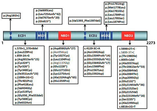 Location of novel ABCA4 variants identified in the study. Nucleotide positions and translation correspond to CCDS747.1 and NP_000341.2, respectively. Only the three mutations of uncertain significance are not in bold letters; ECD1: first extracellular domain; NBD1: first nucleotide binding domain; MSD1: first membrane spanning domain; H: hydrophobic domain; ECD2: second extracellular domain; NBD2: second nucleotide binding domain; MSD2: second membrane spanning domain.