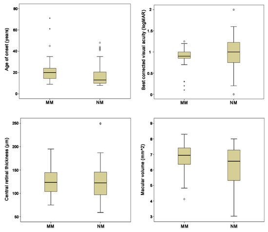 Box-plots showing the comparison of age of onset (AO), best corrected visual acuity (BCVA), central retinal thickness (CRT), and macular volume (MV) for the two genotype groups (patients with at least one null mutation (NM) and patients with two or more missense variants (MM)). The dark line in the middle of the boxes is the median; the bottom of the box indicates the 25th percentile while the top of the box represents the 75th percentile. The T-bars that extend from the boxes represent the minimum and maximum values when they are within 1.5 times the height of the box. The circles are outliers (i.e., values that do not fall in the T-bars). The stars are extreme outliers (i.e., values more than three times the height of the boxes). Only AO shows a statistically significant difference between NM and MM.