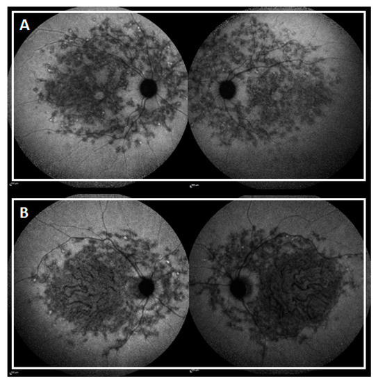 - Klevering, B.J.; Deutman, A.F.; Maugeri, A.; Cremers, F.P.M.; Hoyng, C.B. The spectrum of retinal phenotypes caused by mutations in the ABCA4 gene. Graefes Arch. Clin. Exp. Ophthalmol. 2005, 243, 90–100. [Google Scholar] [CrossRef] [PubMed]