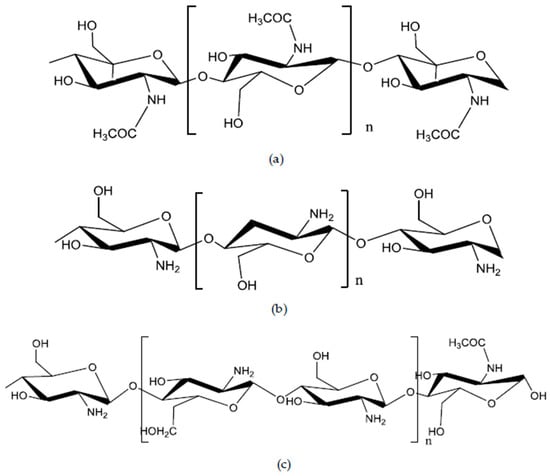 Structure of chitin (a); chitosan (b) and chitooligosaccharide (n ≤ 9, c).