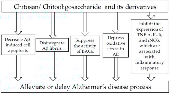 - Ouyang, Q.Q.; Zhao, S.; Li, S.D.; Song, C. Application of chitosan, chitooligosaccharide, and their derivatives in the treatment of Alzheimer’s disease. Mar. Drugs 2017, 15, 322. [Google Scholar] [CrossRef] [PubMed]