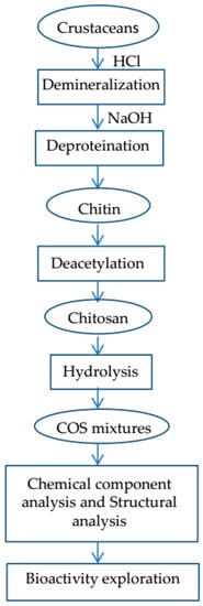 Chitooligosaccharide (COS, Figure 1c), also called chitosan oligomer or chitooligomer, is defined as chitosan with a degree of polymerization ≤20 and an average molecular weight of less than 3900 Da (generally 0.2–3.0 kDa) [,]. Sometimes much larger molecules are also called COS, and there can be very large differences in the activity of short (0.2–0.8 kDa) versus long (2.0–3.0 kDa) oligomers. COS has the advantages of low molecular weight, high solubility, good moisture absorption, strong absorption capacity, and good biocompatibility, etc. Besides, COS has potential ability in promoting food quality and human health and can also prevent the growth of bacteria and fungi [,], exert anti-tumor activity [,], alleviate inflammatory response [,], and act as an immunopotentiator [,,]. COS should be stored under inert conditions and below −20 °C for long-term storage due to its sensitivity to autooxidation. The shelf life of COS is prominently prolonged when antioxidants like vitamin C or salts like sodium chloride are stored with COS []. In this review, we will provide an up-to-date overview of the preparation, analysis and biological activity of COS. COS preparation and analysis process are presented in Scheme 1.