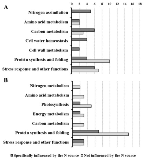 - Scheible, W.R.; Morcuende, R.; Czechowski, T.; Fritz, C.; Osuna, D.; Palacio-Rojas, N.; Schindelasch, D.; Thimm, O.; Udvardi, M.K.; Stitt, M. Genome-wide reprogramming of primary and secondary metabolism, protein synthesis, cellular growth processes, ant the regulatory infrastructure of Arabidopsis in response to nitrogen. Plant Physiol. 2004, 136, 2483–2499. [Google Scholar] [CrossRef] [PubMed]