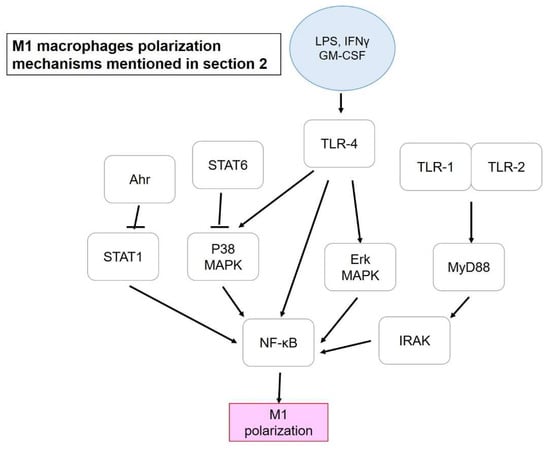 M1 macrophage polarization mechanisms mentioned in Section 2. Blue circle, inducers; white blocks, genes/proteins involved.