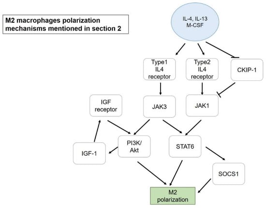 M2 macrophage polarization mechanisms mentioned in Section 2. Blue circle, inducers; white blocks, genes/proteins involved.