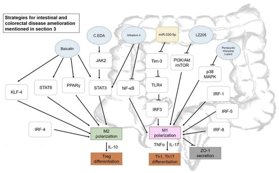 In brief, M1 brings significantly negative effects in colon inflammatory disease and M2 induction becomes a particularly important strategy for amelioration. Nonetheless, the mechanisms of M1 and M2 polarization have to be further illustrated to determine their potential for disease prevention and improvements.