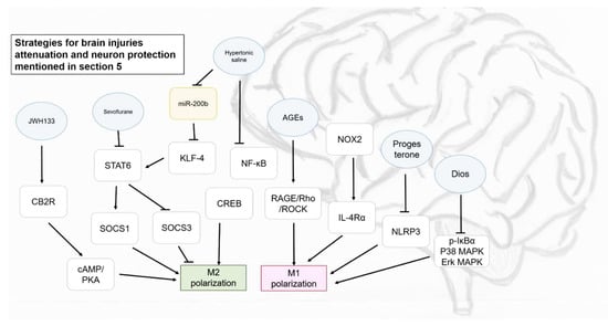 Besides pharmaceuticals, phytochemicals could have a positive impact on disease amelioration by modulating macrophage polarization as well. Surprisingly, some phytochemicals could also bring indirect but efficient protective effects on neurons from activated macrophages, providing therapeutic options in brain injury or neural damage. All of the potential strategies mediating M1 and M2 polarizations in brain diseases, which above-mentioned are as presented in Figure 4.