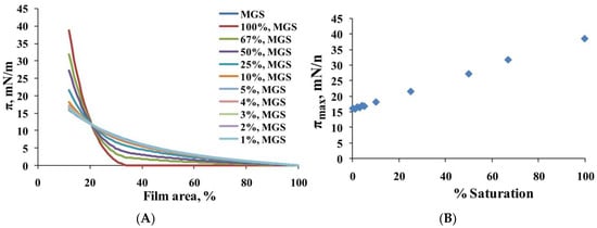 The acyl chain saturation-induced changes in MGS material properties were well manifested in the dependence of the reciprocal compressibility modulus, Cs−1 (calculated from the π/A isotherms via Equation (2), see Section 4.2.1), on the % of saturation (Figure 2). It can be seen that the increase of % saturation raised the maximum value of Cs-1 from 8–10 mN/m (at 0–5% saturation of MGS) to 55 mN/m (at 100% saturated MGS), thus suggesting the formation of stiffer films with the raise of acyl chain saturation (at ≥10% saturation).