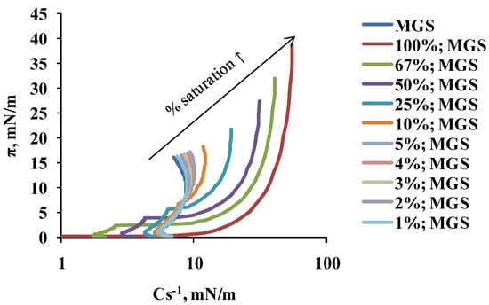 The dependence of surface pressure on isotherm reciprocal compressibility (Cs−1; shown on log scale) of MGS films (intact and with different degree of catalytic saturation). Cs−1 was calculated from the π/A isotherms shown at the upper panel of Figure 1 by Equation (2) (see Section 4.2.1).