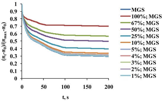 The stress relaxation transients (Figure 4) of samples with 1–10% saturation were almost identical (as shown by p ≥ 0.1 obtained by ANOVA comparison between the curves []) to the one of native MGS (0% saturation). For the rest of the layers, the increase in catalytic saturation shifted the surface pressure relaxation transients to higher π increment values (a manifestation of increased elasticity) and changed the shape of the transients (i.e., there was change in the structure and molecular rearrangement processes in the films).