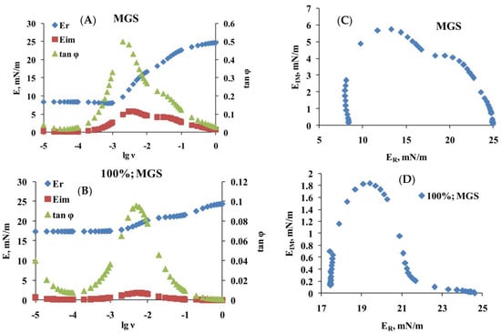 Rheological parameters obtained via Fourier transformation (A,B) and Cole-Cole (ER vs. EIM) plots (C,D) of intact and 100% saturated MGS films, respectively. The results for 25, 50, and 67% saturated MGS are presented as a Supplementary file.